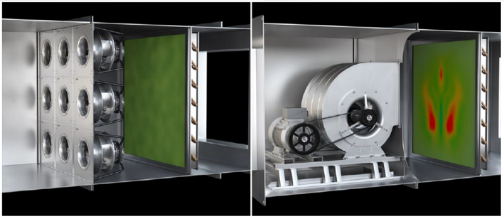在實際應(yīng)用中, FanGrids風(fēng)墻的優(yōu)勢不勝枚舉。多臺風(fēng)機堆疊或成排安裝,盡可能地利用空間。它使得氣流分布更為出色,并確保通過過濾器或熱交換器等上/下風(fēng)口的組件獲得更均勻的氣流,從而提高空氣過濾效率及傳熱性能。某臺風(fēng)機發(fā)生故障后,其余風(fēng)機將進行風(fēng)量補償,因此冗余功能提高了整個系統(tǒng)的運行可靠性。