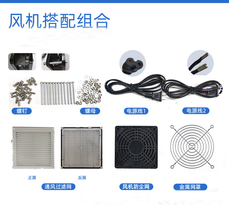 風(fēng)機(jī)配件:端子、電源線、通風(fēng)過濾網(wǎng)、防塵網(wǎng)罩等