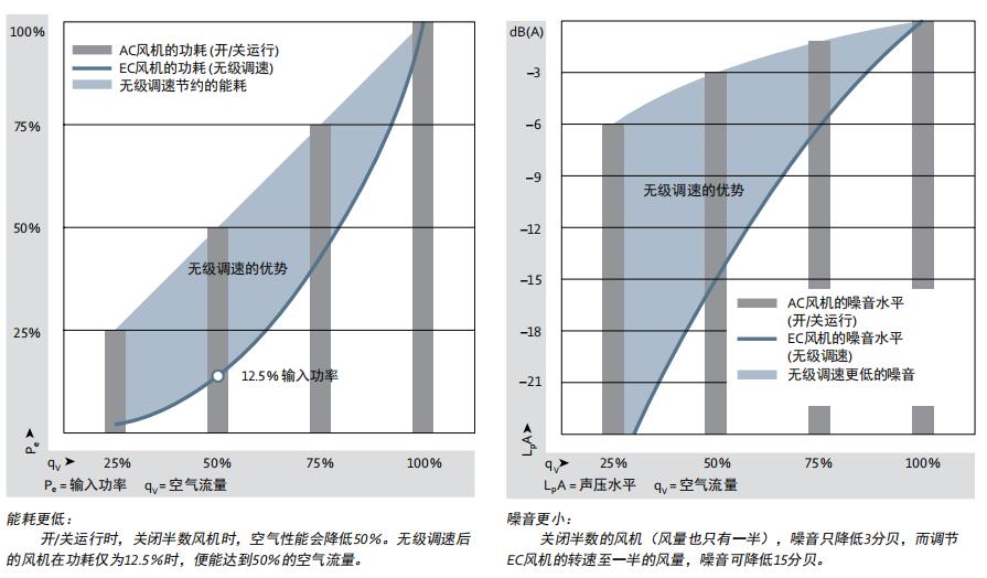 下圖直觀地比較了開/關(guān)運行與無極調(diào)速時,潛在的節(jié)能和降噪的情況: