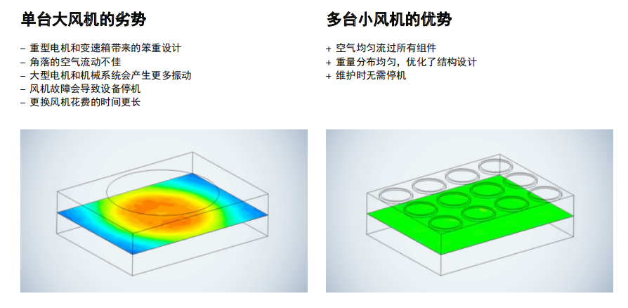 風(fēng)墻技術(shù),采用多個風(fēng)機并聯(lián)運行的模式,可大幅提高運行的可靠性并確保有恒定的風(fēng)量流過冷卻塔,可提供超高空氣流量。如果其中一臺設(shè)備需要維修,其他風(fēng)機會提高風(fēng)量,以彌補損失的空氣流量,使冷卻塔達(dá)到相同制冷量且不間斷運行。此外,即插即用的方式使風(fēng)墻解決方案的安裝更加便利。通過MODBUS RTU,可直接監(jiān)控風(fēng)墻的運行狀態(tài),無需定期維護,僅根據(jù)設(shè)備狀態(tài)按需進行便可,用戶可更輕松地規(guī)劃服務(wù)方案。